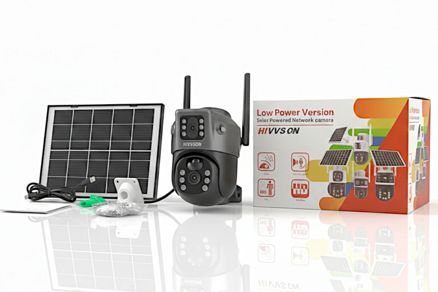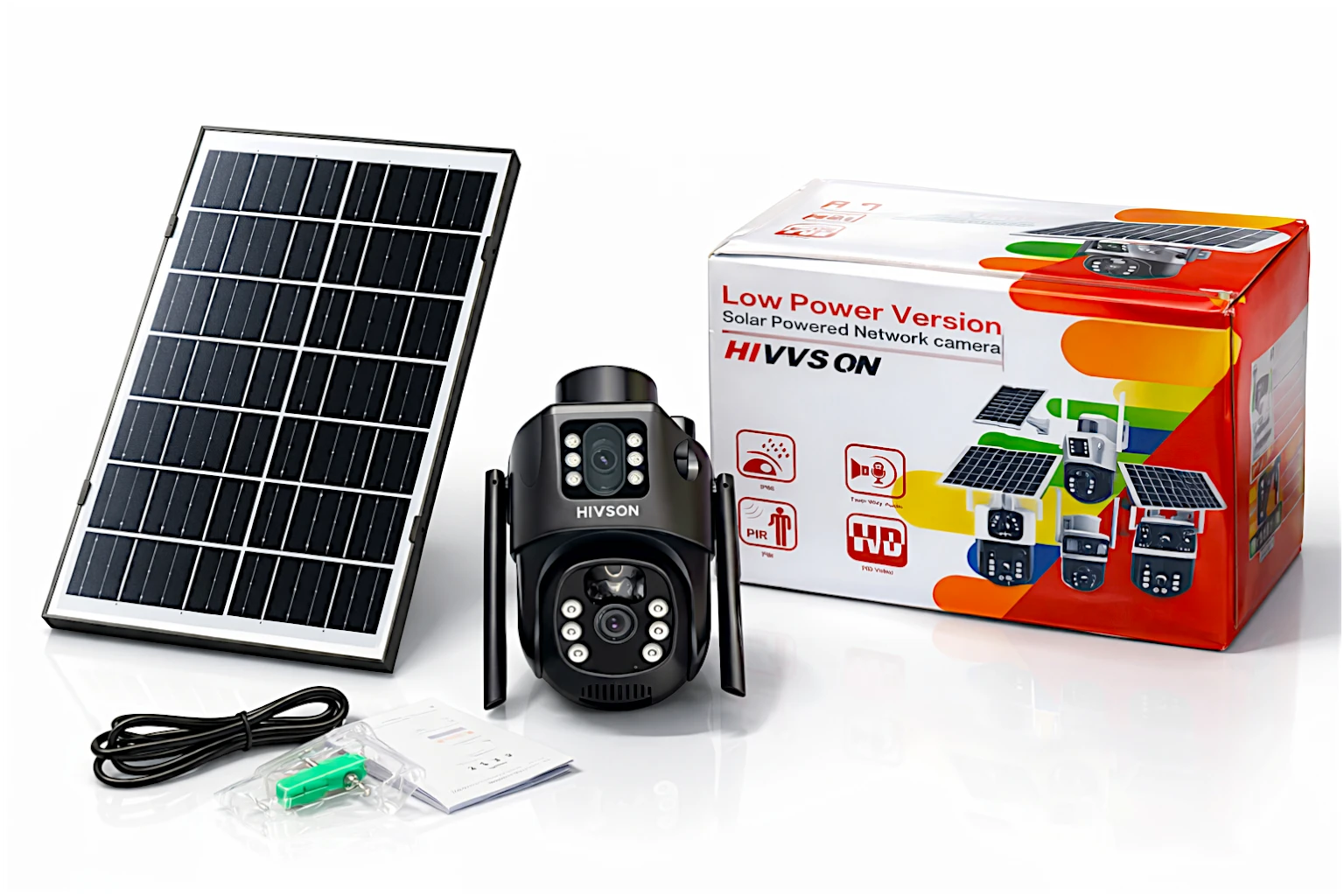 The HIVSON Solar Powered PTZ Security Camera delivers intelligent, off-grid surveillance with full 360° coverage. Designed for outdoor environments, it features PIR motion detection, color night vision, two-way audio, and real-time alerts—all powered by an efficient solar panel.