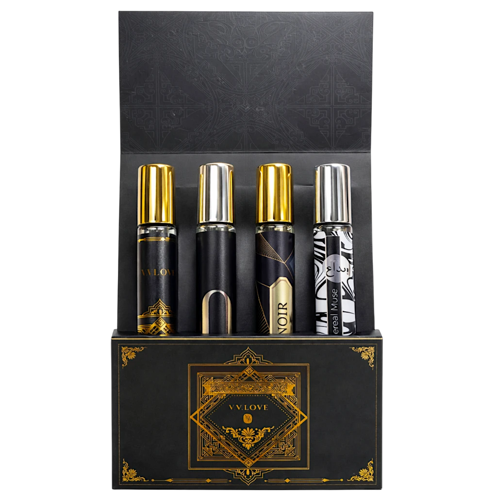 V.V.Love Summer Black Gold 4-piece Eau de Toilette gift set includes four 35ml fragrances in a luxury black and gold box. Featuring Tilal Al Oud, 0 PM, Serenity Noir, and Ethereal Muse, this EDT collection is ideal for gifting and versatile wear.